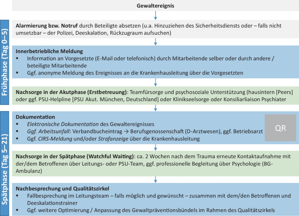 - Nachsorge sollte allen Mitarbeitenden sowohl in der Frühphase (z. B. psychosoziale Unterstützung) als auch in der Spätphase (u. a. Watchful-Waiting-Prinzip) nach Gewaltvorfall angeboten werden