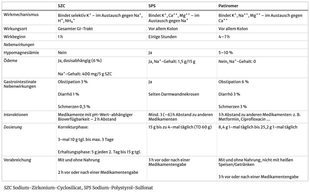 - Dosierungen, Wirkung und Nebenwirkungen für intestinale Kaliumbinder (s. Tabelle)