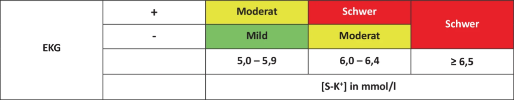 - Einteilung basiert einerseits auf absoluter Höhe der [S‑K+] und andererseits auf Vorliegen von Hyperkaliämie-assoziierten EKG-Veränderungen als Ausdruck einer schweren Gesundheitsgefährdung