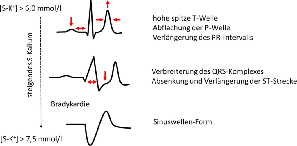- potenziell unmittelbar vital bedrohliche Auswirkungen einer Hyperkaliämie sind jene auf das Myokard