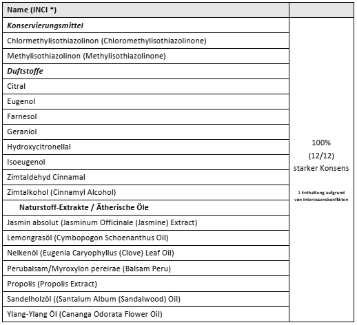 - Inhaltsstoffe der Tabelle 1 sollten speziell bei vorgeschädigter Haut in beruflichen Hautmitteln nicht enthalten sein