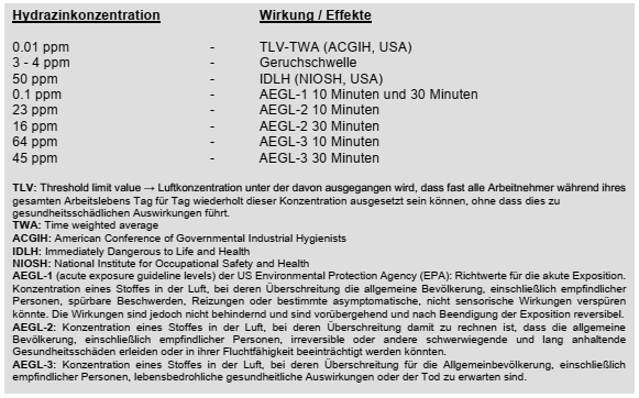- starke Verätzungen bei direktem Kontakt der Augen oder feuchter Haut mit flüssigem Hydrazin oder konzentriertem Gas