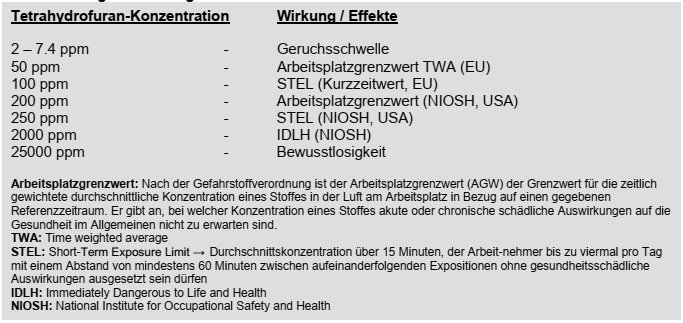 - Reizungen der Augen mit Rötung, Brennen, Tränenfluss oder krampfhaftem Lidschluss bei lokaler Einwirkung von flüssigem Tetrahydrofuran oder hohen Dampfkonzentrationen