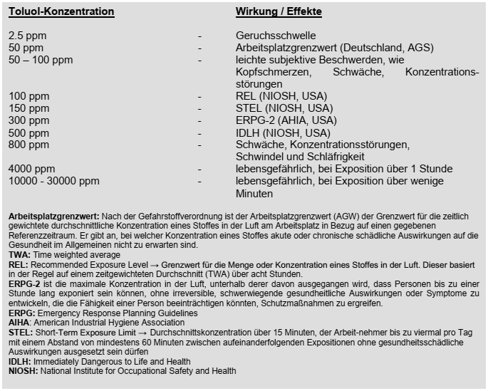 • Reizungen der Haut bei lokaler Einwirkung von flüssigem Toluol