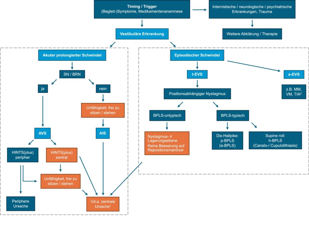 - bei akutem prolongiertem Schwindel (akutes vestibuläres Syndrom, AVS) ist Abgrenzung zwischen gefährlichen zentralen (z. B. Schlaganfall) und peripheren (z. B. akute unilaterale Vestibulopathie, AUVP) Ursachen essenziell