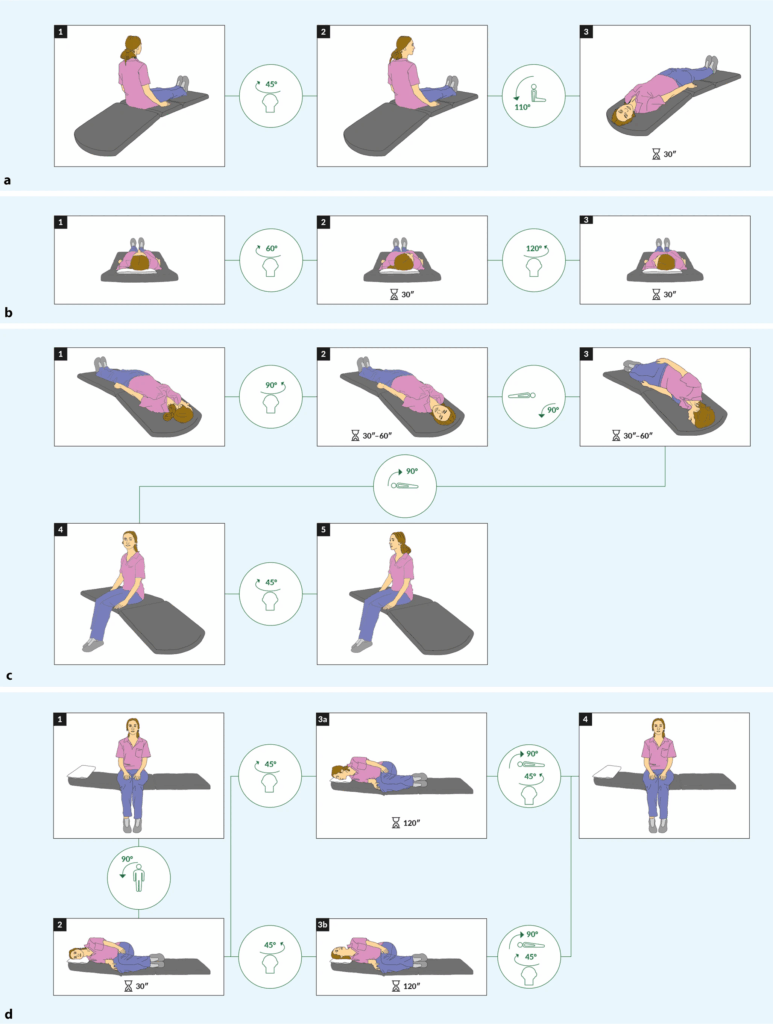 - Reposition eines BPLS des rechten posterioren Bogengangs mittels Epley-Manöver erfolgt schrittweise wie abgebildet und mit ausreichenden Pausen (30–60 s) pro Position (c)