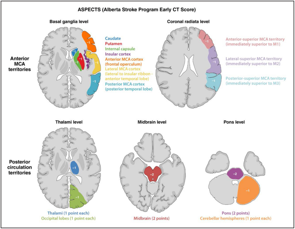 - Notfall-Hirnbildgebung mittels CT ohne Kontrastmittel oder MRT als Erstdiagnostik bei V.a. AIS, um ischämische Belastung (z.B. ASPECTS) zu beurteilen und ICB vor Reperfusion auszuschließen