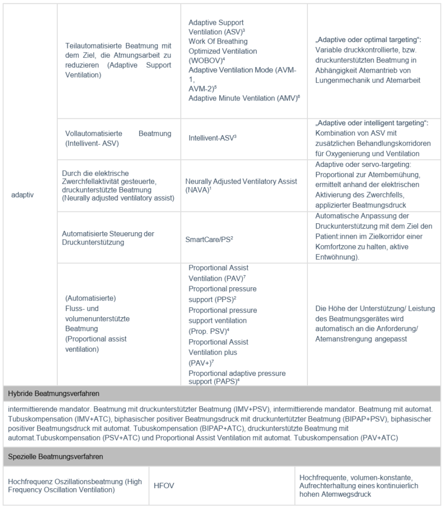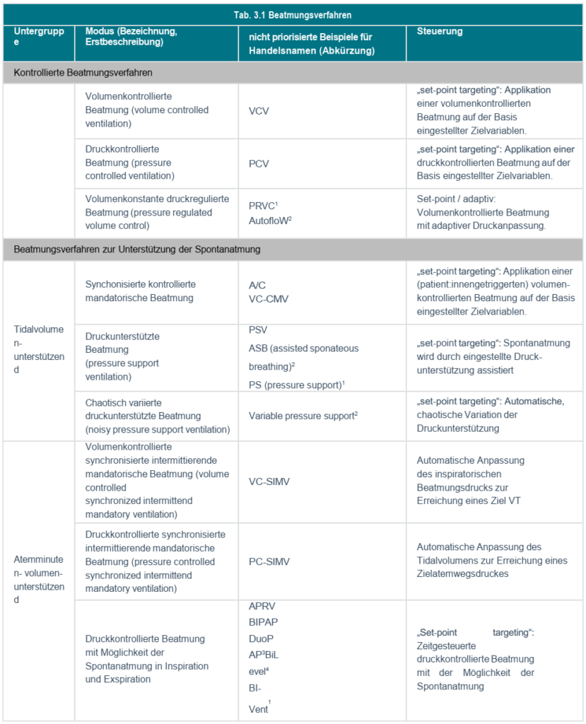 - Tabelle aller in der Leitlinie berücksichtigten Beatmungsformen