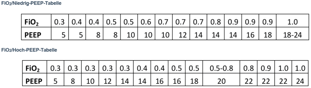 - bei Patient*innen mit mildem ARDS eine orientierende Einstellung des PEEP mit Hilfe der FiO2/niedrig-PEEP-Tabelle des ARDS-Netzwerks erwägen