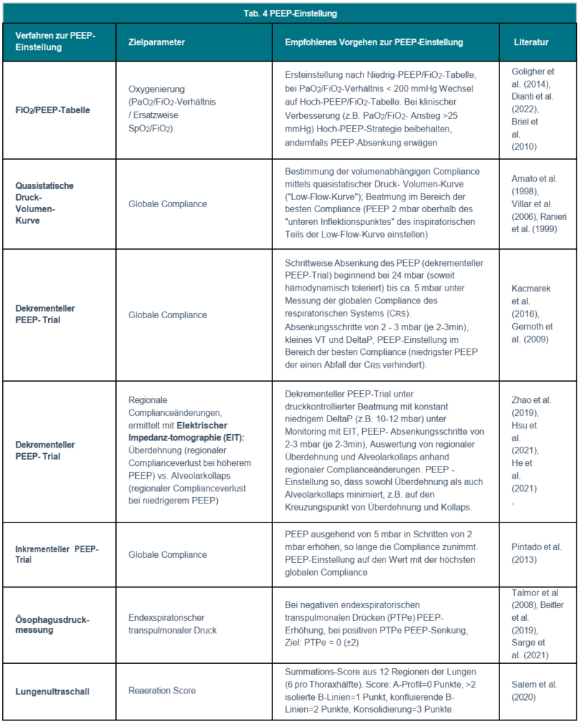 - bei Patient*innen mit moderatem oder schwerem ARDS die Einstellung des PEEP mit Hilfe einer in nachfolgenden Tabelle vorgeschlagenen bettseitigen Methoden individualisieren