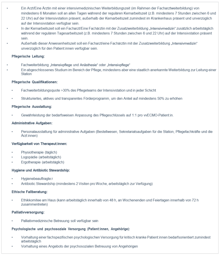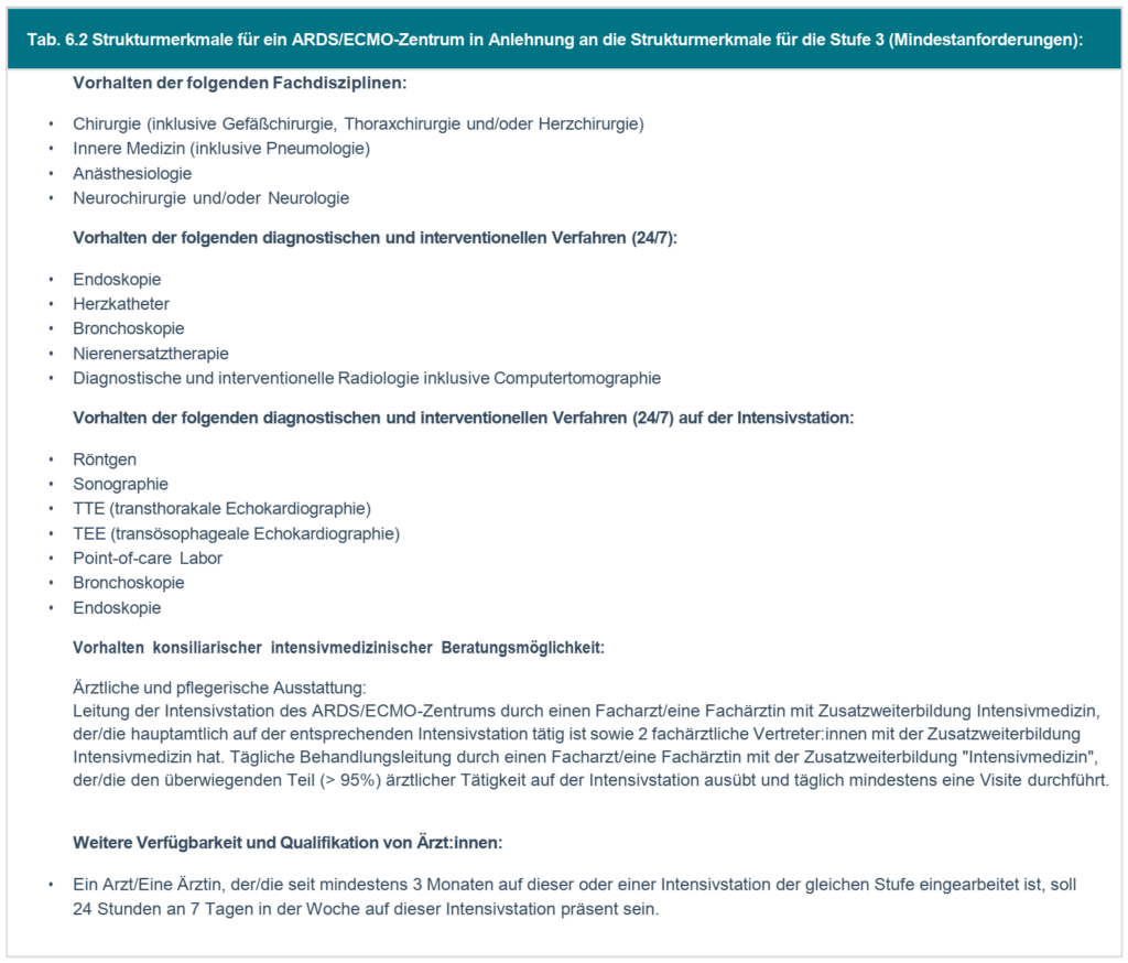 - Strukturmerkmale für ein ARDS/ECMO-Zentrum in Anlehnung an die Strukturmerkmale für die Stufe 3 (Mindestanforderungen)