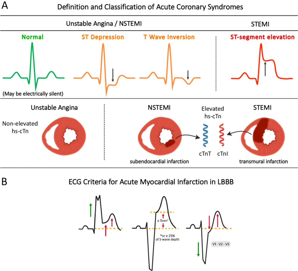 - nicht-ischämische Muster, zu denen normale EKGs, unspezifische Befunde, linksventrikuläre Hypertrophie (mit oder ohne ST-Streckenveränderungen), Links- oder Rechtsschenkelblock oder ventrikulärer Schrittmacherrhythmus gehören, die die Sgarbossa-Kriterien oder modifizierten Sgarbossa-Kriterien für akuten Myokardinfarkt nicht erfüllen