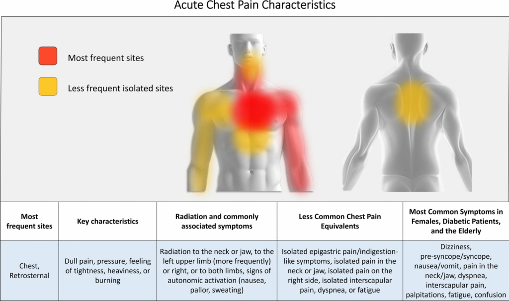 - Schmerz auch außerhalb des Thoraxbereiches auftreten und in andere Körperregionen wie Schulter, Arm, Hals, Oberbauch oder Kiefer ausstrahlen