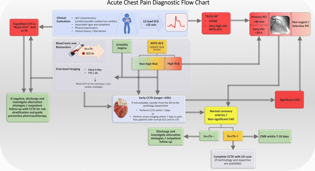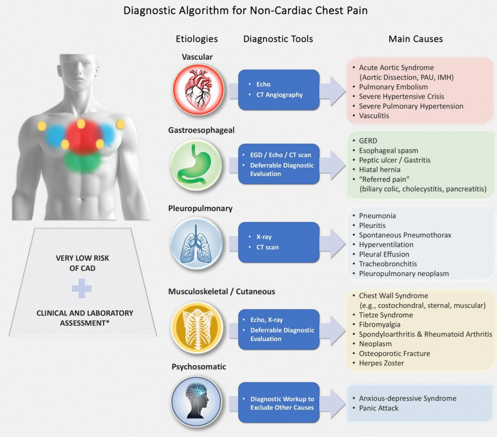 - erste klinische Beurteilung zielt auf die schnelle Erkennung und Behandlung potenziell lebensbedrohlicher Zustände wie ACS, Aortendissektion, Lungenembolie und infarktähnliche Myokarditis ab