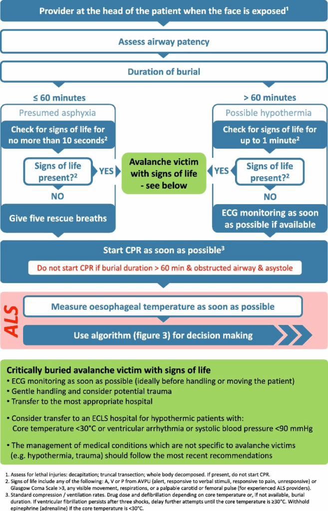 - medizinische Versorgung kritisch verschüttete Lawinenopfer kann von der Anwendung eines evidenzbasierten Algorithmus profitieren (siehe Algorithmus)