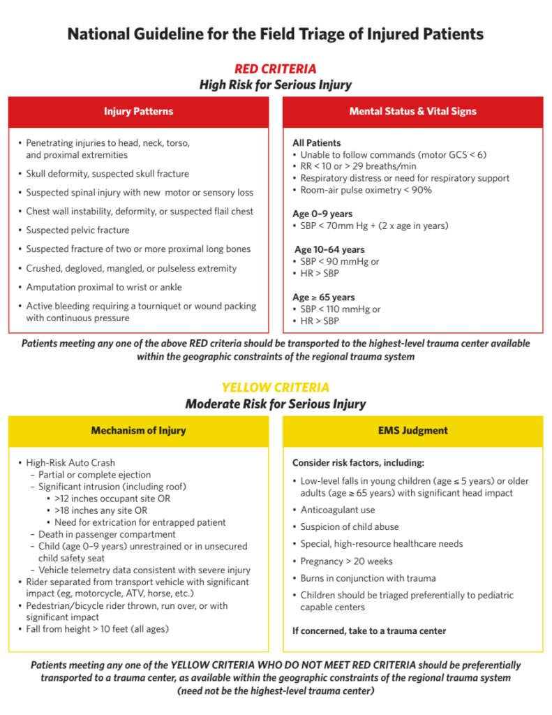 - präklinisch tätiges Notfallpersonal sollten Patient*innen mit Verdacht auf Beckenfrakturen, die auch andere Triage-Kriterien der National Trauma Triage Guidelines (siehe Grafik) erfüllen, nach Möglichkeit in ein großes Traumazentrum transportieren (unter bestimmten Umständen Transport mit Luftrettungsmittel erwägen)